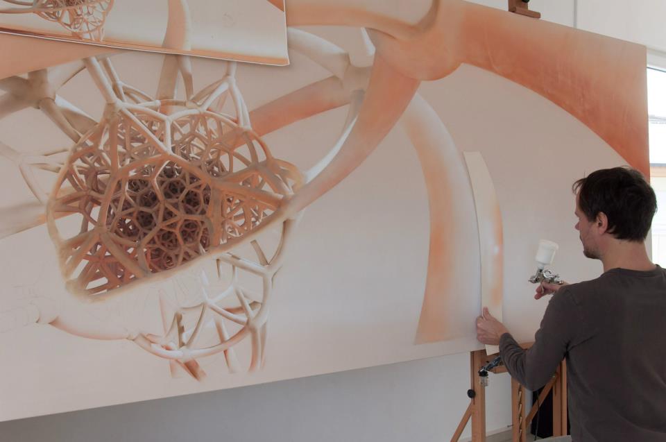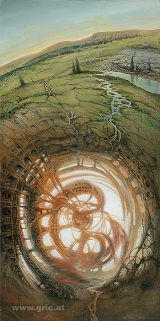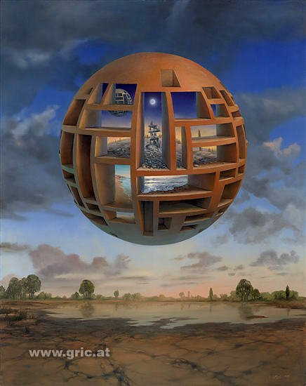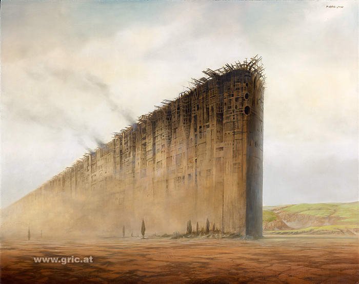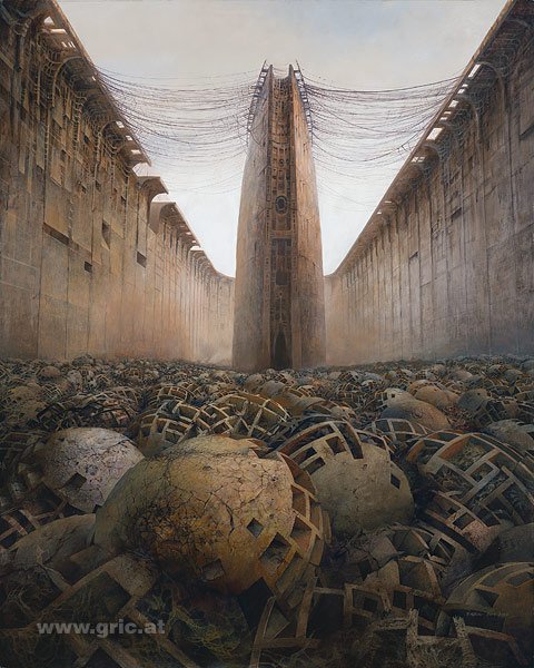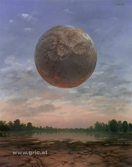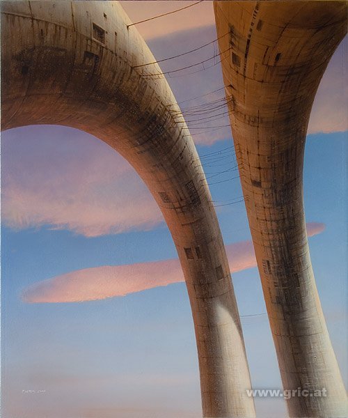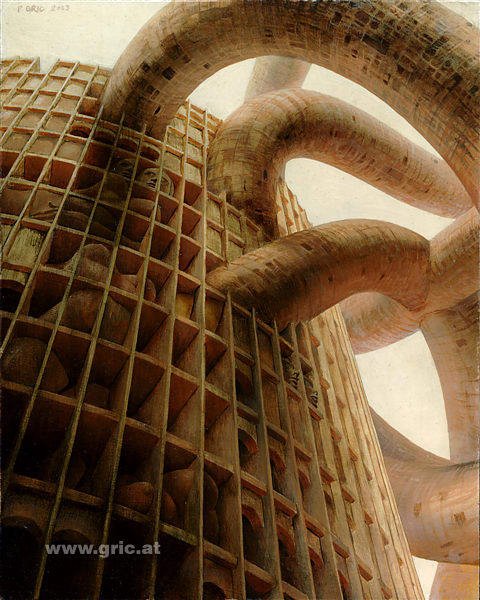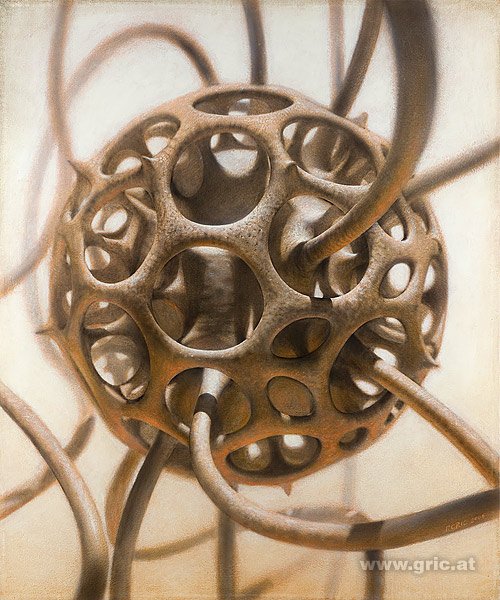 In the early nineties Peter Gric started to discover the possibilities of computer graphics for his paintings. From then on his organic-surreal visual imagery was enriched by complex architectural structures and artefacts. In place of using pencil and sketchbook he began to design his compositions with a 3D visualization software, he started to transfer the virtual reality into painting and consequently found within this fusion to his very unique and distinctive stile.