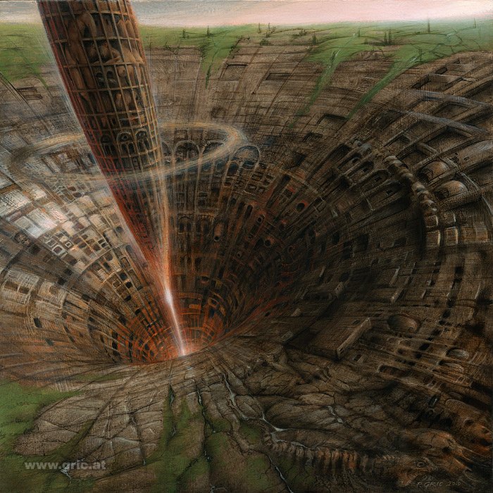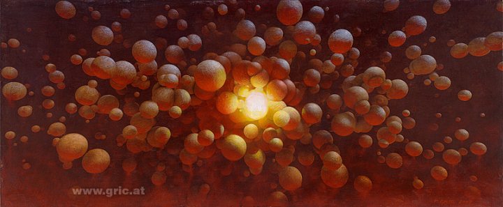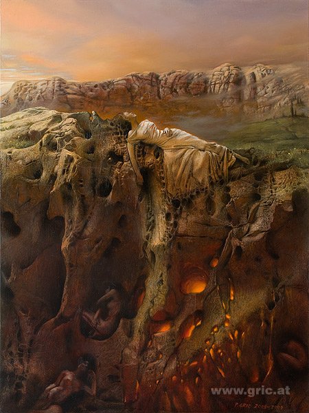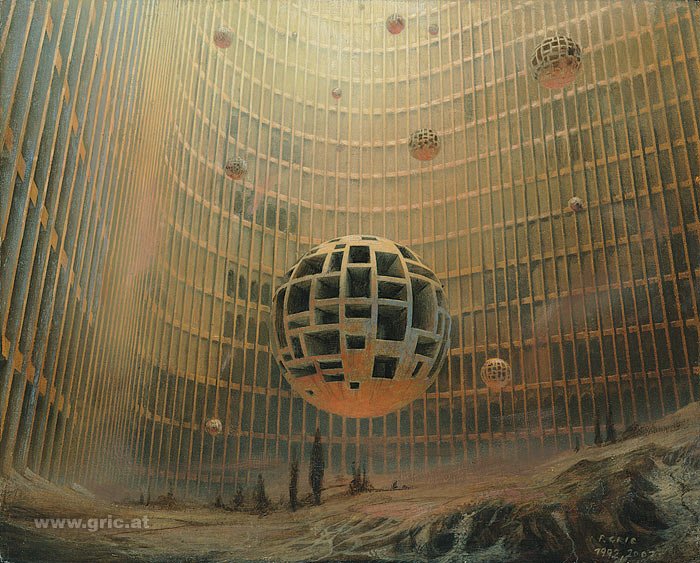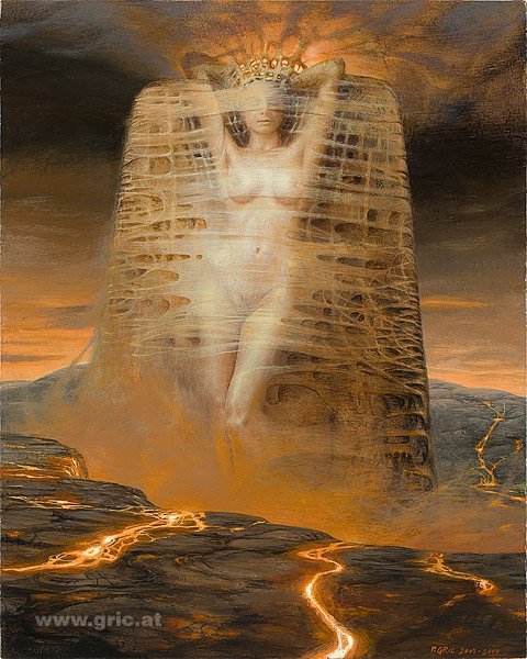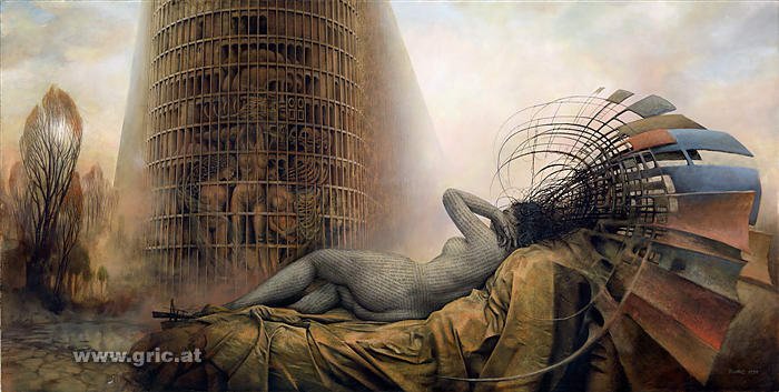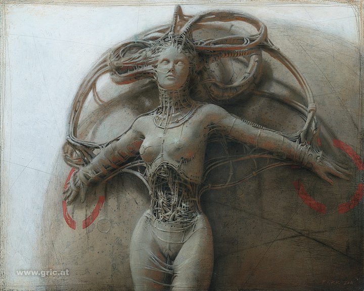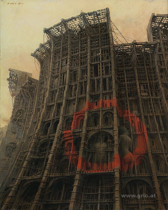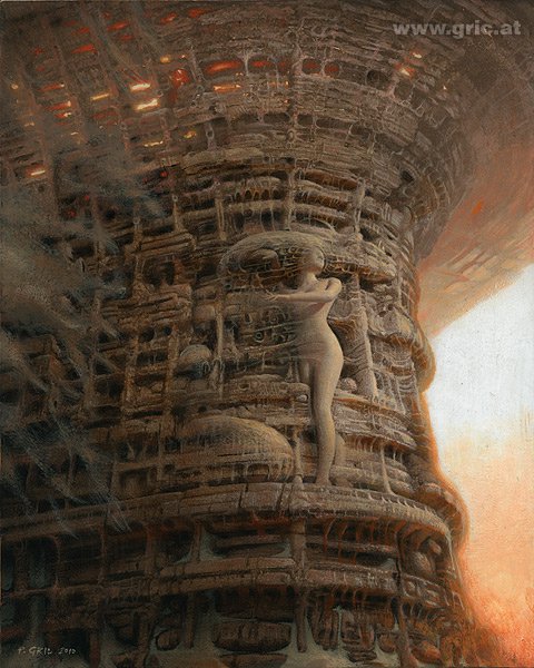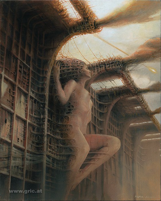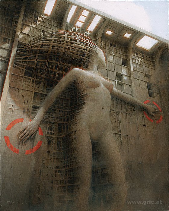 Le début des années 90, que Peter Gric a commencé à découvrir les possibilités de l'infographie pour ses peintures. Ensuite, son imagerie visuelle organique-surréaliste a été enrichi par objets et structures architecturales complexes. À la place à l'aide de crayon et carnet de croquis, il commença à concevoir ses compositions avec un logiciel de visualisation 3D, il a commencé à transférer la réalité virtuelle dans la peinture et par conséquent trouvé dans cette fusion à son stile très unique et distinctif.Cette méthode est encore plus évidente dans sa série « Espaces artificiels ». Ces peintures sont basées sur des géométries tridimensionnelles construits avec quelque chose comme un « système de virtual building block » ou d'autres concepts mathématiques et algorithmiques. La création de ces images devient une pièce de théâtre avec des espaces complexes et de perspectives afin de créer des lieux non accessibles normalement dans un arrangement complètement artificiel d'espace et la lumière. En traduisant ces concepts virtuels en peinture, l'IRGC tente d'entrer dans ces espaces artificiels et les rendre tactile. Il cherche à donner la forme et le fond, mettre hors de leur état virtuel à une importante manifestation.En plus de son IRGC espaces artificiels expérimente aussi le nu humain associé à mineral, technoïde et structures architecturales. Malgré le fait, que les organes de cette série « Mnemosyne » sont souvent dissous et fragmentés, il obtient sciemment ou même met l'accent sur la composante érotique. Dans cette série, son origine fantastique et surréaliste est plus apparent.Peter est né à Brno, l'ancienne Tchécoslovaquie en 1968 comme le seul enfant du couple artiste épousé Ludmila et Jaroslav Gric. Déjà dans son enfance, ses parents reconnu et soutenu son talent pour le dessin et la peinture. Dans les années 1980, ses parents ont décidé d'émigrer et via la Hongrie et l'Yougoslavie, ils sont arrivés à l'Autriche. Ils ont passé un an à Edlach/Reichenau un der Rax, par la suite, ils ont déménagé à Linz où Peter a terminé l'école primaire et un collège technique pour la création graphique. En 1988, il est venu à Vienne et a commencé à étudier à l'Académie des beaux-arts dans la classe de maître du Prof. Arik Brauer. Déjà au cours de l'étude, il a participé à plusieurs expositions collectives et a commencé à vendre ses peintures. Il a terminé l'étude en 1993 et a obtenu une maîtrise en beaux-arts. 2009 Peter quitte Vienne pour Oberhöflein au plateau Hohe Wand est proche des Alpes orientales. Il a deux filles, Emilia (2002) et Natalia (2005).2010 IRGC travaille sur le Concept Design pour projet de film de Guillermo del Toro « Les Montagnes hallucinées ».Depuis 2011 l'IRGC a une fonction d'enseignant à travaux de .gric de l'Académie des beaux-arts de Vienne est en possession de nombreuses collections privées et publiques : Austria State Gallery Oberes Belvedere à Vienne, la Galerie municipale à Traun / Autriche, Künstlerhaus München / Allemagne, Collection d'Art visionnaire à Melbourne / Australie, Collection Rardy van Soest en Houden / Holland, Trierenberg Art à Traun / Autriche, beinArt Collection / AustralieWestermann Collection / Allemagne
