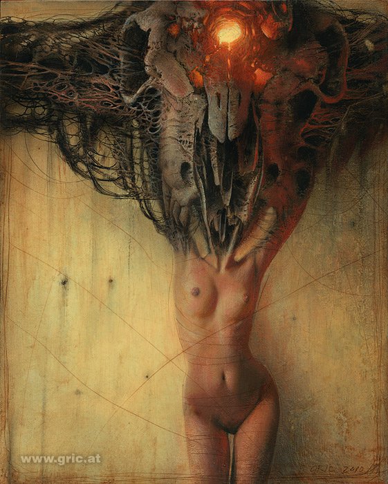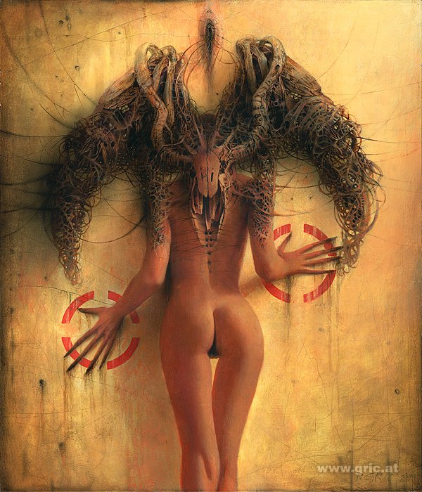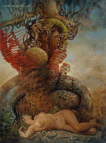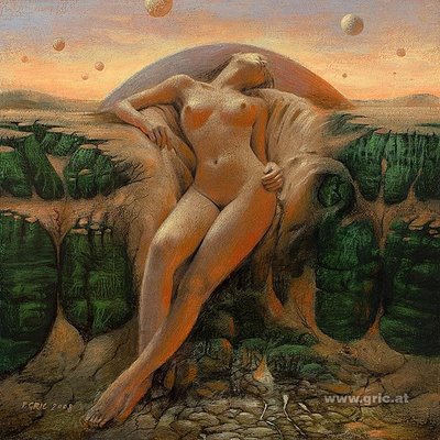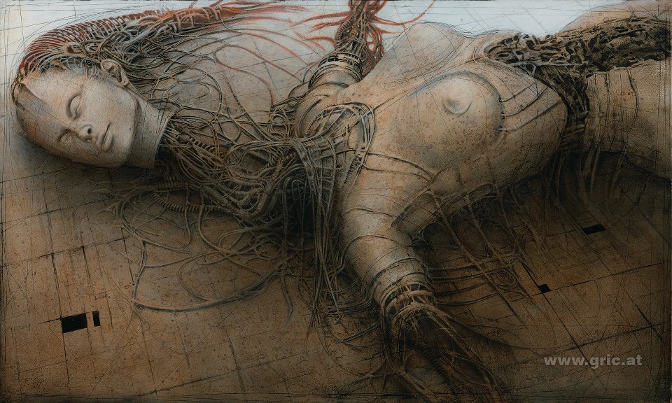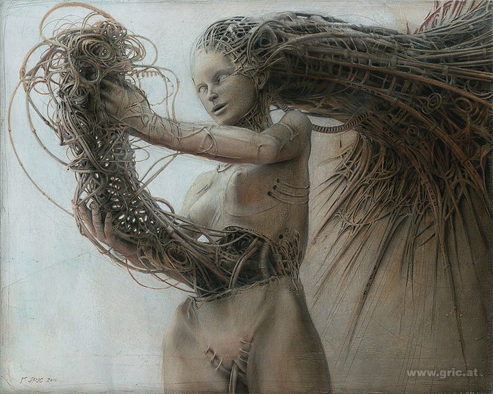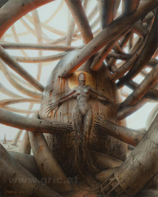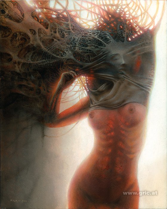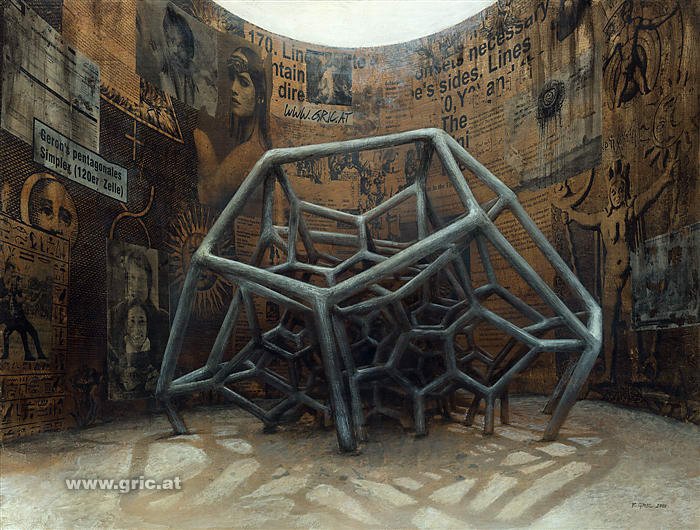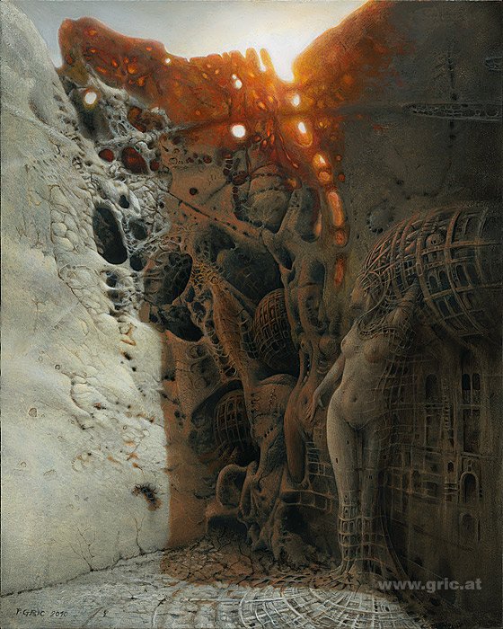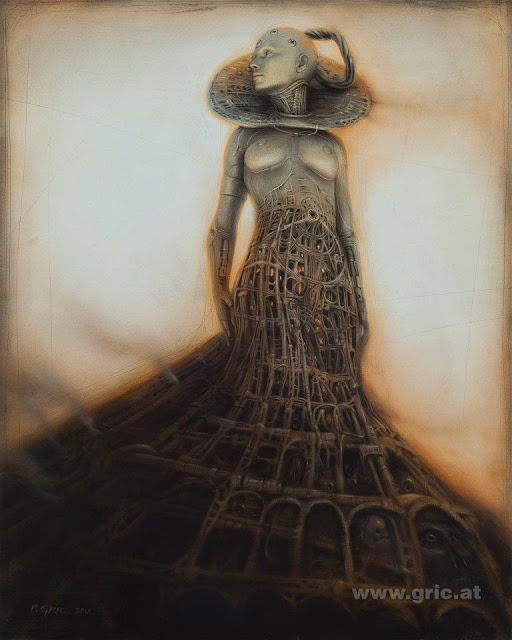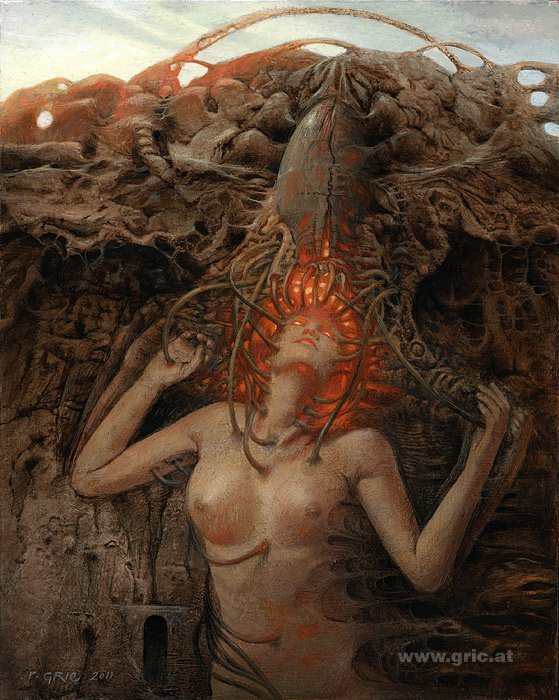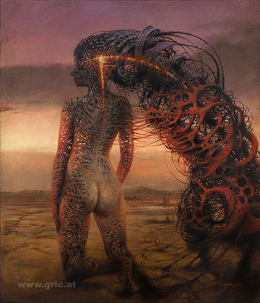 En los comienzos de los noventa que Peter Gric empezaron a descubrir las posibilidades de gráficos por ordenador para sus pinturas. Luego de su imaginería visual orgánica-surreal fue enriquecida por artefactos y estructuras arquitectónicas complejas. En lugar de usar lápiz y bocetos que comenzó a diseñar sus composiciones con un software de visualización 3D, empezó a transferir la realidad virtual en pintura y en consecuencia se encuentra dentro de esta fusión a su estilo único y distintivo.Este método es más evidente en su serie "Espacios artificiales". Estas pinturas se basan en geometrías tridimensionales construidos con algo como un "sistema de bloque virtual" u otros conceptos matemáticos y algorítmicos. La creación de estas imágenes se convierte en un juego con espacios complejos y perspectivas para crear lugares normalmente no accesible en un arreglo totalmente artificial de espacio y luz. Por traducir estos conceptos virtuales en pintura, Gric intenta entrar en esos espacios artificiales y tornarlos táctiles. Busca dar forma y sustancia, llevándolos fuera de su estado virtual a una gran manifestación.Además de su Gric espacios artificiales también experimenta con el desnudo humano combinado con minerales, technoid y estructuras arquitectónicas. A pesar del hecho de que los cuerpos de esta serie "Mnemosyne" son a menudo disuelto y fragmentados, se obtiene deliberadamente o incluso hace hincapié en el componente erótico. En esta serie es más evidente su origen fantástica y surrealista.Peter nació en Brno, la antigua Checoslovaquia en 1968 como el único hijo de la pareja de artistas se casó con Ludmila y Jaroslav Gric. Ya en su infancia sus padres reconocieron y había apoyado su talento para el dibujo y la pintura. En el año 1980 sus padres decidieron emigrar y a través de Hungría y Yugoslavia llegaron a Austria. Pasaron un año en Edlach/Reichenau un der Rax, luego se mudaron a Linz, donde Peter terminó la escuela primaria y un colegio técnico para diseño gráfico. En 1988 vino a Viena y comenzó a estudiar en la Academia de Bellas Artes en la clase magistral del Prof. Arik Brauer. Ya durante el estudio participó en numerosas exposiciones colectivas y comenzó a vender con éxito sus pinturas. Terminó el estudio en 1993 y obtuvo una maestría en Bellas Artes. 2009 Peter se mudó desde Viena a Oberhöflein en la meseta de Hohe Wand está cerca de los Alpes orientales. Tiene dos hijas, Emilia (2002) y Natalia (2005) Gric 2010 ha estado trabajando en el concepto de diseño para el proyecto de la película de Guillermo del Toro "En las montañas de la locura".Desde 2011 Gric tiene una tarea de enseñanza en obras de .gric de la Academia de Bellas Artes de Viena están en posesión de numerosas colecciones privadas y públicas: Austria estado Galería Oberes Belvedere en Viena, Galería Municipal en Traun / Austria, Künstlerhaus München / Alemania, colección de arte de visionario en Melbourne / Australia, colección Rardy van Soest en Houden / Holanda, arte Trierenberg en Traun / Austria, beinArt colección / AustraliaColección Westermann / Alemania