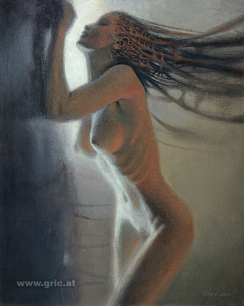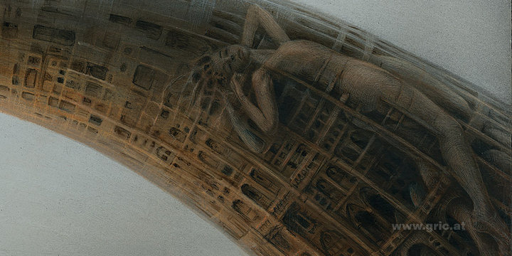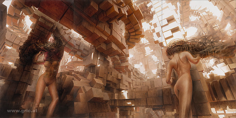 In addition to his Artificial Spaces Gric also experiments with the human nude combined with mineral, technoid and architectural structures. Despite the fact, that the bodies of this “Mnemosyne” series are often dissolved and fragmented, he wittingly obtains or even emphasizes the erotic component. In this series his phantastic and surreal origin is most apparent.
