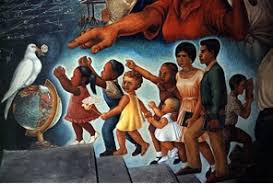 En este primer mural podemos observar la presencia de libros: símbolos del conocimiento. Billetes: símbolos de la riqueza de la burguesía, y objetos religiosos. La maestra está representada como heroína y a la vez como mártir. Se trata la educación de manera en que el espectador se enfrenta a las dificultades históricas que provocaron en la sociedad los intentos gubernamentales por erradicar la educación religiosa en las escuelas.